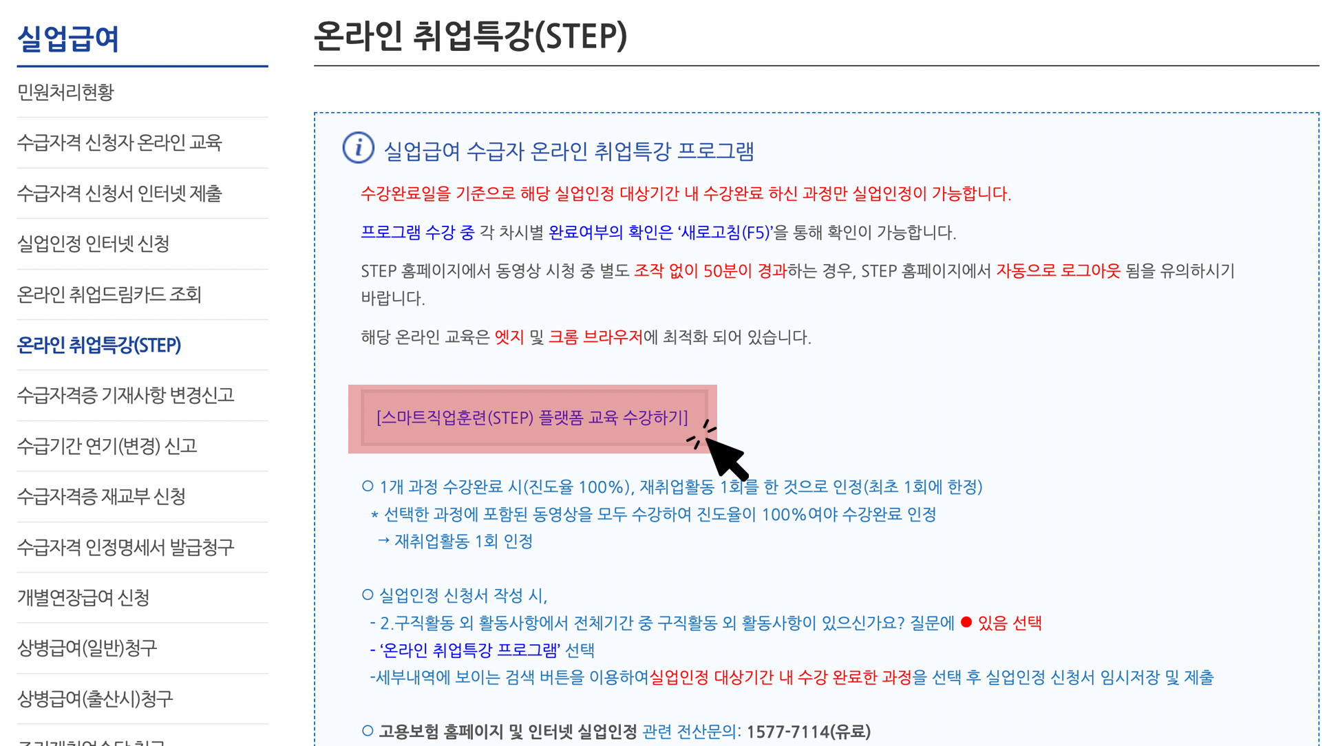 클릭 후 상세 메뉴가 나오면 '온라인 취업특강(STEP)' 를